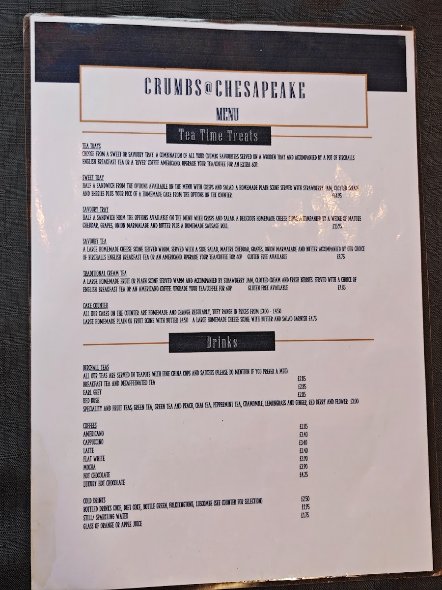 The menu features an inviting selection of Tea Time Treats, including tempting sweet and savory trays perfect for sharing. Indulge in their luxurious traditional cream tea, or explore the mouthwatering cake counter that delights with homemade creations. For drinks, Crumbs serves specialty coffees like cappuccinos, lattes, and their signature luxury hot chocolate, all warmly received by patrons eager for unique flavors.